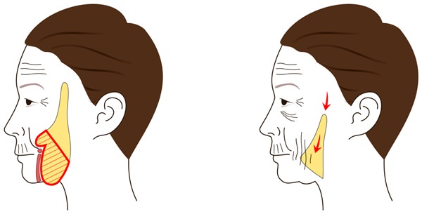 バッカルファットとは、頬の深い部分に存在する脂肪です。若い間は、上の図のように頬の高い位置を中心にありますが、加齢によって脂肪を支える組織が衰えると、下図のように下垂します。