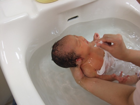 赤ちゃんのオムツを取ったら、ひざの上に仰向けにして抱えます。そして、手早く顔、頭、体の順番に洗っていきます。そのあと湯船に赤ちゃんを上向きにして浮かせるようにして、背中やお尻を洗いましょう。赤ちゃんはこのときとてもリラックスした顔を見せるかもしれません。多少お湯が顔にかかっても心配はありません。子宮にいたころの自分を楽しんでいるのかもしれません。